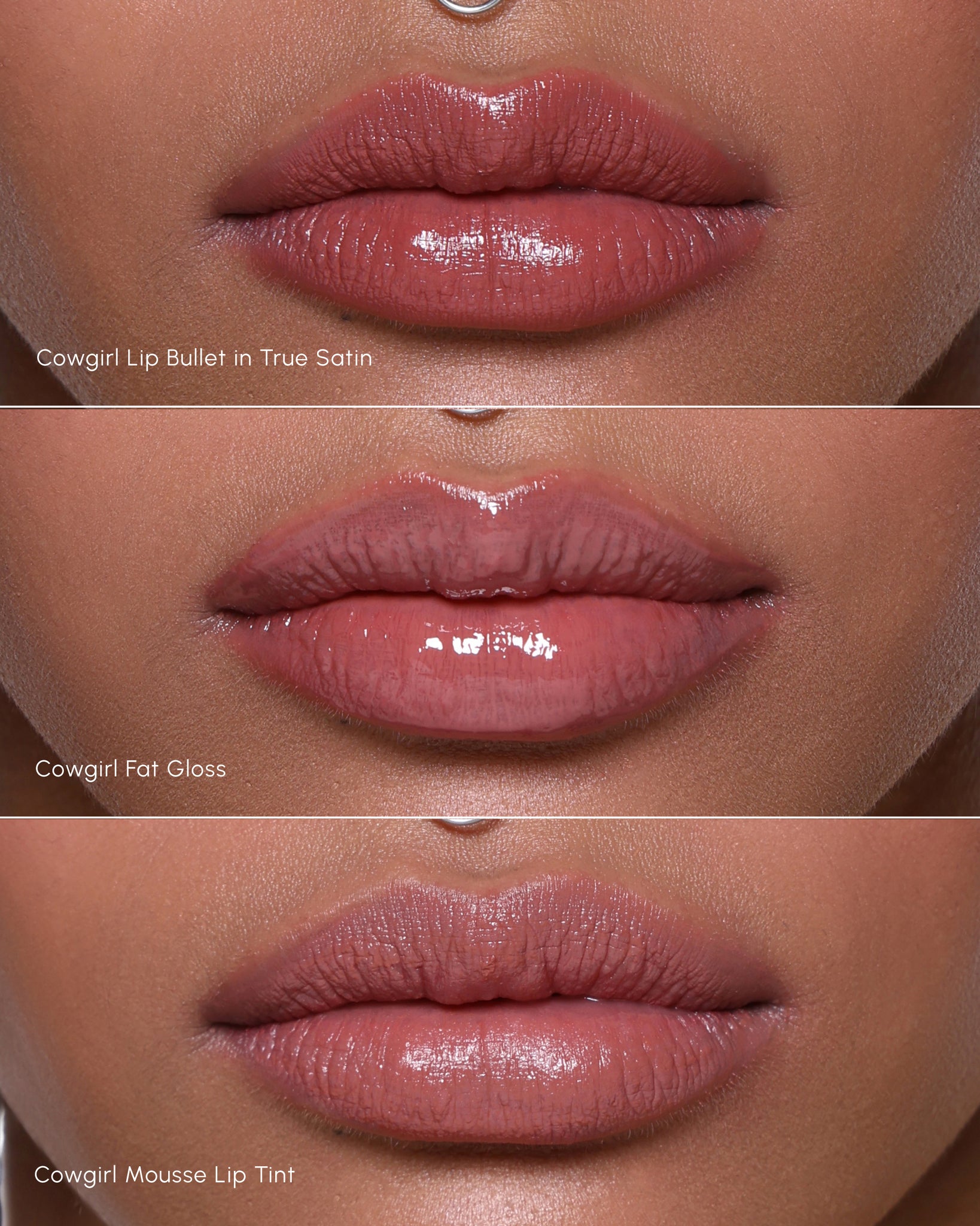 Fat Gloss in COWGIRL - a milky muted rose Lip Bullet True Satin in COWGIRL - neutral muted rose Mousse Lip Tint in COWGIRL - milky muted rose